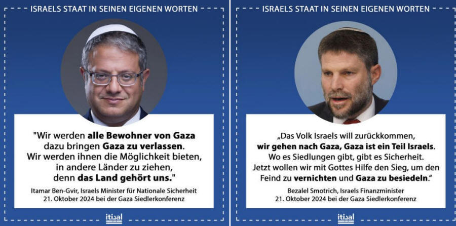 Am 21. 10. 2024 kündigte Israels Minister für Nationale Sicherheit, Itamar Ben-Gvir an, dass die israelische Regierung dafür sorgen würde, dass „alle Bewohner Gazas“ Gaza verlassen.