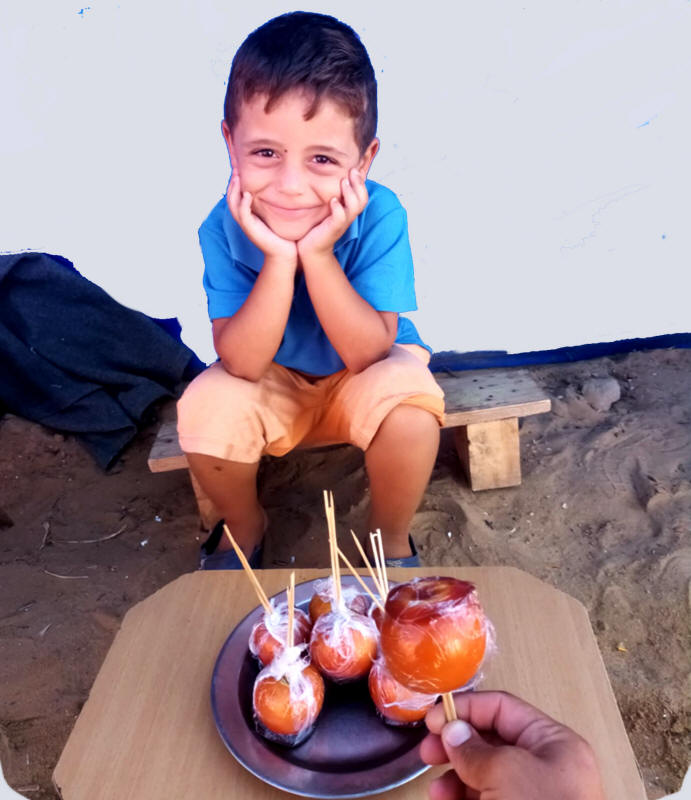 Mein Neffe Mahmoud, 6 Jahre alt, verkauft kandierte Äpfel vor dem Zelt der Familie in Deir al-Balah. Foto mit freundlicher Genehmigung der Familie