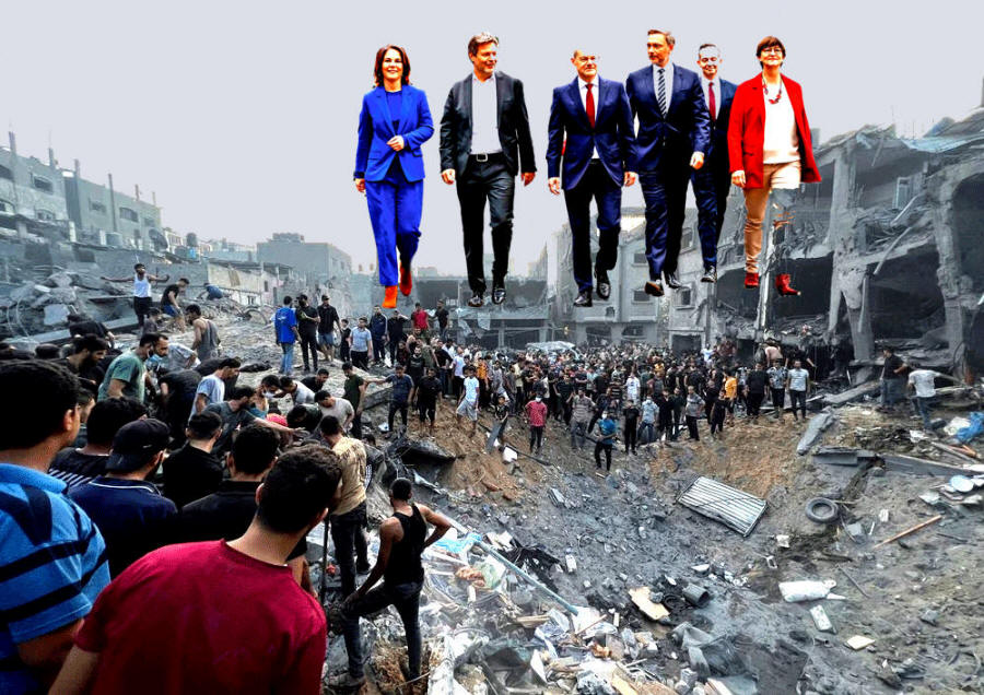 Allen voran die Bundesregierung, deren vorbehaltlose Unterstützung Israels eine Bundeskanzlerin, einen Außenminister und einen Botschafter in Israel einschließt, die alle nach wie vor die Verbrechen Israels angesichts des Völkermords leugnen.