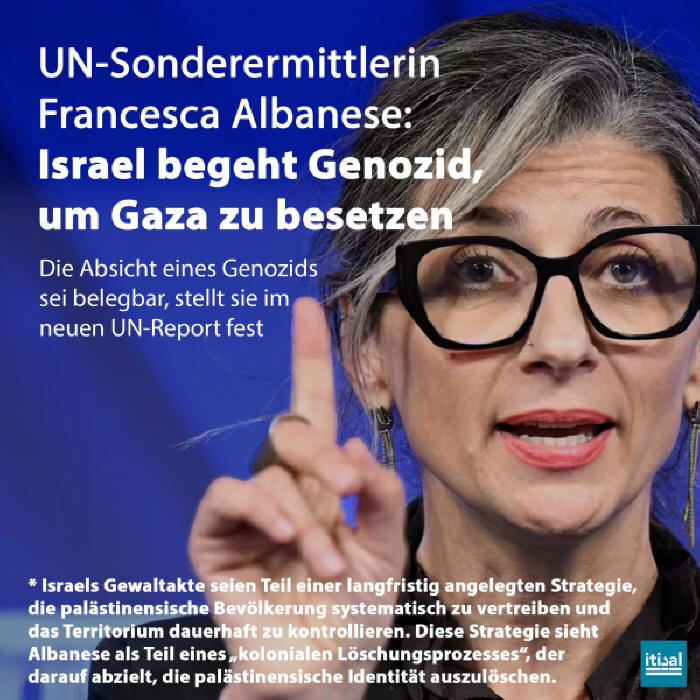 Die UN-Sonderberichterstatterin für Palästina, Francesca Albanese, verurteilte ihre Äußerungen umgehend und warnte: "Wenn Deutschland beschließt, sich an die Seite eines Staates zu stellen, der internationale Verbrechen begeht, dann ist das eine politische Entscheidung, die aber auch rechtliche Konsequenzen hat.