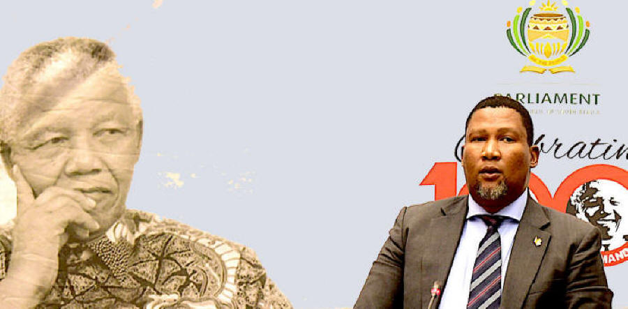 Nkosi Zwelivelile Mandla Mandela mit einem Plakat seines Großvaters Nelson Mandela bei einer Feier zur Verabschiedung der südafrikanischen Verfassung im Jahr 2018. (RegierungZA, Flickr, CC BY-ND 2.0)