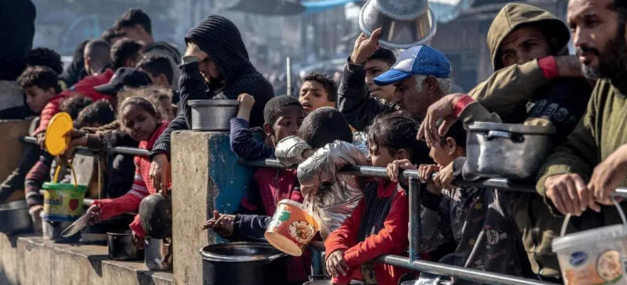 Vertriebene Bewohner in Gaza warten in langen Schlangen auf Nahrungshilfe in gravierenden Engpässen, da der Konflikt und Zugangsbeschränkungen Tausende an den Rand des Hungertodes treiben. Foto: WHO