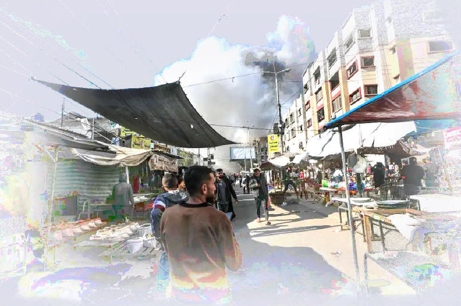 Palästinenser beobachten den aufsteigenden Rauch während eines israelischen Angriffs auf die al-Faruq Moschee im Flüchtlingslager Nuseirat im mittleren Gazastreifen.