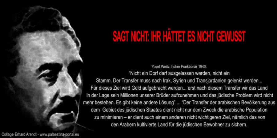 Auch der US-amerikanische Ökonom Michael Hudson macht sich keine Illusionen über die historische Tiefe dieser Politik. In seinen Worten: „Der Völkermord, den Sie heute erleben, ist also eine ausdrückliche Politik, und das war die Politik der Vorväter, der Gründer Israels. Die Idee eines Landes ohne Menschen war ein Land ohne Araber, ein Land ohne nicht-jüdische Menschen. Das war es, was es wirklich bedeutete. Sie sollten noch vor der offiziellen Gründung Israels, der ersten Nakba, dem arabischen Holocaust, vertrieben werden. Und die beiden israelischen Premierminister waren Mitglieder der Stern-Bande von Terroristen. Die Terroristen wurden zu den Herrschern Israels …“