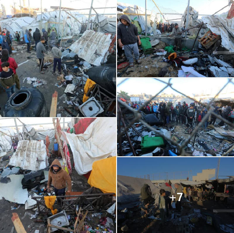 Die Kamera von WAFA dokumentiert die Zerstörung der Zelte vertriebener Palästinenser nach einem israelischen Luftangriff in Deir al-Balah im zentralen Gazastreifen.
