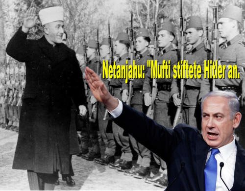 Netanyahu verleiht Hitler die Kosher-Imprimatur! - Große "Staatsmänner"!? - Dr. Ludwig Watzal - Der israelische Ministerpräsident Benjamin Netanyahu greift nach jedem Strohhalm, um sein unterdrückerisches und rassistisches Besatzungsregime von jedem Makel reinzuwaschen, und die naive deutsche politische und mediale Nomenklatura, insbesondere im Berliner Regierungsviertel, scheinen sich damit zufrieden zu geben. Die Israeltreue Bundeskanzlerin sollte sich bei Netanyahu für diese Steilvorlage bedanken, braucht sie ihn doch jetzt nicht für seine brutale Unterdrückung der Palästinenser zu "kritisieren" und sich gleichzeitig für die Hitler-Gräueltaten zu entschuldigen. Nach Netanyahu trägt nämlich nicht Adolf Hitler die eigentliche Verantwortung für den Massenmord am europäischen Judentum, sondern der palästinensische Großmufti Amin al-Husseini. Gott sei Dank, kann man da nur sagen! Folglich braucht die deutsche politische Klasse keine Solidarität mehr mit den unterdrückten Palästinensern zu üben, sondern nur noch fest an der Seite der israelischen Unterdrücker und Besatzer zu stehen. Netanyahu hat die Deutschen endlich von einer ungemeinen schweren Bürde befreit! Sie können sich nun wieder ohne Gewissensbisse voll ins kriegerische Getümmel stürzen >>>