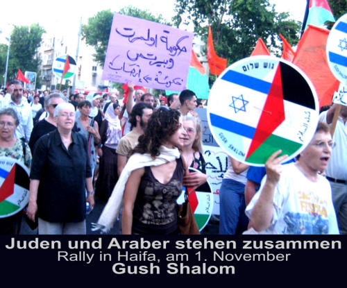 An Sonntag wollen wir in der Stadt Haifa zusammenstehen, in einer Stadt, die uns den Weg zu einem geneinsamen Leben in vollkommener Gleichheit führen kann und muss . Zusammenstehend rufen wir zu einem Frieden auf, der sich auf Unabhängigkeit und Gerechtigkeit für beide Völker gründet, auf vollkommene Gleichheit auf allen Gebieten des Lebens, auf ein Ende von Rassismus und Diskriminierung.