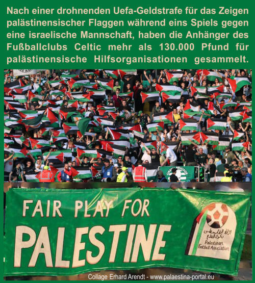 Anhänger des Fußballclubs Celtic sammeln 130.000 Pfund für palästinensische Hilfsorganisationen - 24.08.16 - Nach einer drohnenden Uefa-Geldstrafe für das Zeigen palästinensischer Flaggen während eins Spiels gegen eine israelische Mannschaft, haben die Anhänger des Fußballclubs Celtic mehr als 130.000 Pfund für palästinensische Hilfsorganisationen gesammelt. Der europäische Dachverband leitete letzte Woche ein Disziplinarverfahren gegen den Club aus Glasgow ein, nachdem Fans Flaggen während eines Spiels gegen die israelische Mannschaft Hapoel Be’er Sheva gezeigt hatten, in dem sie 5:2 gewannen. Das Rückspiel in Israel am Dienstag endete mit 2:0 für Hapoel Be’er Sheva. Dort gab es keine palästinensischen Flaggen und es gab anscheinend keinerlei Vorfälle. Am Sonntag richtete die Gruppe Die grüne Brigade (The Green Brigade) einen Appell auf der Website gofundme ein, um die erwartete Geldstrafe zahlen zu können und schon am Dienstag morgen waren mehr als 80.000 Pfund eingegangen. Die Fans sammeln für Medical Aid Palestine, eine Organisation die denjenigen medizinische Unterstützung bietet, die am stärksten durch den Konflikt, die Besatzung und Vertreibung betroffen sind und für das Lajee Centre, ein Kultur und Sportprojekt für Kinder im Flüchtlingslager Aida in Bethlehem. Im Appell heißt es: „Während des Champions League Spiels mit Hapoel Be’er Shevaam am 17. August 2016 präsentierten die Green Brigade und Fans des Celtic Park die Fahne für Palästina. Für diesen Akt der Solidarität erhielten Celtic Respekt und Beifall auf der ganzen Welt. Die Aktion führte auch zu einer Disziplinarstrafe durch die Uefa, die die palästinensische Fahne als „unerlaubtes Banner“ bezeichnete.“ „Als Antwort auf diese kleinkarierte und politisch voreingenommene Reaktion durch >>>