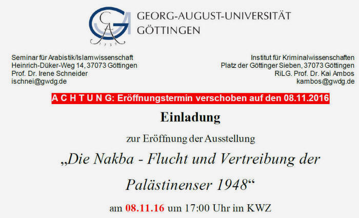 Nach Antisemitismus-Vorwürfen gegen eine Ausstellung und eine Vortragsreihe zum Nahost-Konflikt an der Universität Göttingen ist die Hochschule auf die Kritiker zugegangen. - Bernd Schlegel - Die Ausstellung „Die Nakba – Flucht und Vertreibung der Palästinenser 1948“ werde statt wie geplant an diesem Dienstag, erst eine Woche später eröffnet, sagte ein Sprecher der Universität. Dies sei das Ergebnis eines Gespräches zwischen der Leitung der Hochschule, dem Allgemeinen Studierendenausschuss und dem Fachschaftsrat Sozialwissenschaften. Die Ausstellung wird zunächst im Kulturwissenschaftlichen Zentrum (KWZ), Heinrich-Düker-Weg 14, gezeigt. Anschließend ist sie in der zweiten November-Hälfte im Zentralen Hörsaalgebäude (ZHG) zu sehen >>>