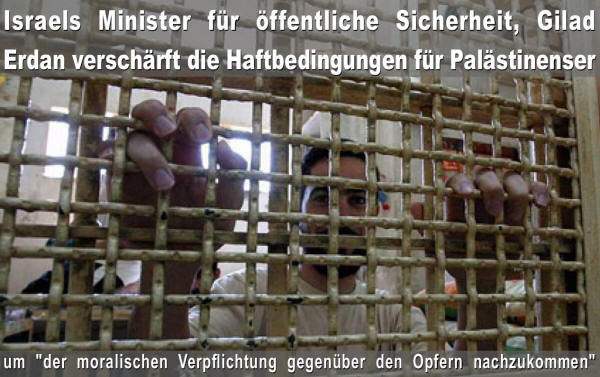 Israel verschärft die Haftbedingungen für Palästinenser, um "der moralischen Verpflichtung gegenüber den Opfern nachzukommen". -  3 Jan, 2019 - Israel wird die Haftbedingungen für palästinensische Gefangene mit einem Kochverbot und Einschränkungen bei Besuchen und Wassernutzung bewusst verschlechtern. "Diese Party geht zu Ende", sagte der israelische Minister für öffentliche Sicherheit.