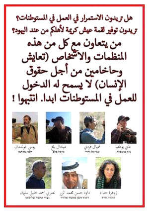 Auf dem Flyer steht: "Möchtest du weiter in den Siedlungen arbeiten? Möchtest du für deine Familien von den Juden leben? Wer mit einer dieser Personen und Organisationen (Ta'ayush und Rabbiner für Menschenrechte) zusammenarbeitet, wird nie in die Siedlungen zur Arbeit gehen dürfen. Seid gewarnt!"