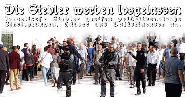 Eine Horde von 55 israelischen Siedlern, von Polizisten begleitet, brach im Rahmen der morgendlichen Frühmesse in die al-Aqsa-Moschee ein und führte eine Serie von frevelhaften Rundgängen durch, die über drei Stunden dauerte. 10 israelische Polizisten in zivilen Outfits tauchten ebenfalls vor Ort auf.