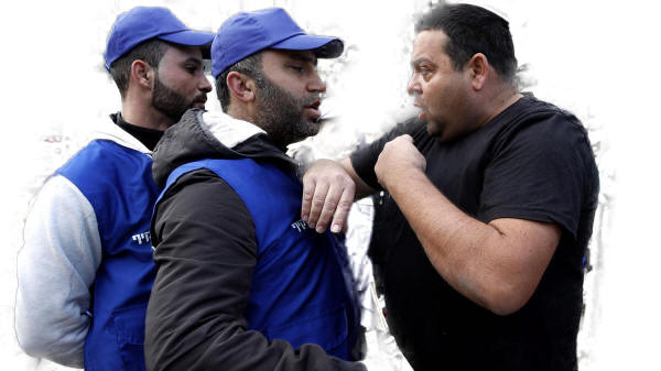 Ein israelischer Siedler argumentiert mit Palästinensern in blauen Westen, die sie während eines Protestes gegen das Ende des Mandats für die zeitweilige internationale Präsenz in Hebron als "Beobachter" bezeichneten. Abed Al Hashlamoun / EPA