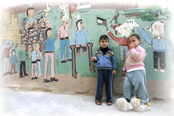 Ein junger palästinensischer Junge und ein palästinensisches Mädchen stehen in der Nähe eines bemalten Wandbildes im Flüchtlingslager Balata in der Stadt Nablus im Westjordanland. (Miriam Alster/Flash90)