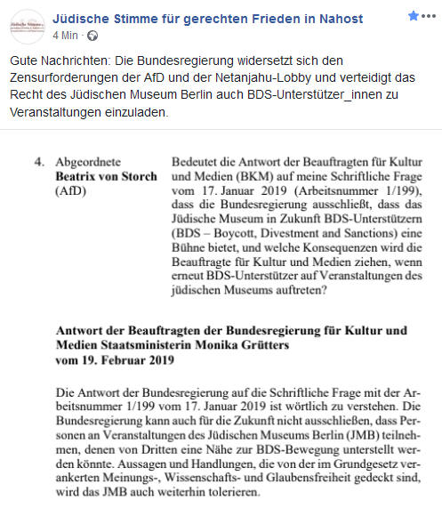Die Jüdischen Stimme wurde als antisemitisch verleumdet. Begründet wurde dies mit ihrer Unterstützung der BDS-Kampagne, obwohl es sich dabei um eine menschenrechtsorientierte Kampagne handelt.