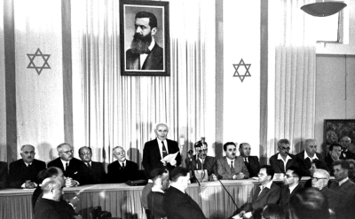 Baraah DaraziDavid Ben Gurion (C), Israels erster Premierminister, erklärte am 15. Mai 1948 die Unabhängigkeit des Staates Israel – nach dem Votum der UNO zur Teilung Palästinas am 29. November 1947
