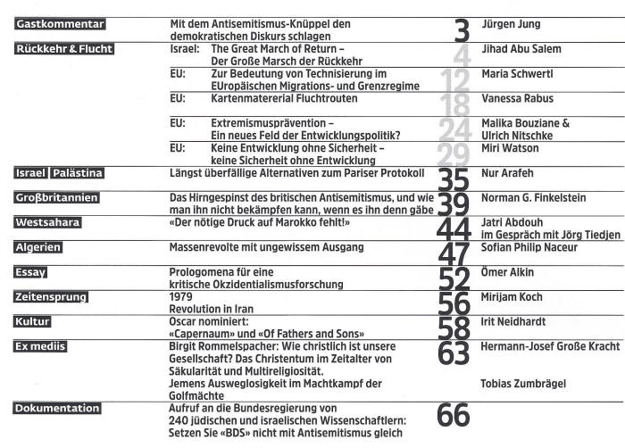 70 Seiten, € 5,50Mit Beiträgen von: Jürgen Jung, Jihad Abu Salem, Maria Schwerti, Vanessa Rabus, Malika Bouziane, Ulrich Nitschke, Miri Watson, Nur Arafeh, Norman G. Finkelstein, Jörg Tiedjen, Sofian Philip Naceur, Ömer Alkin, Mirijam Koch, Irit Neidhardt, Hermann-Josef Große Kracht, Tobias Zumbrägel.