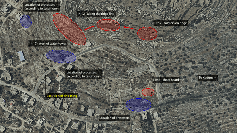 Bekannte Bewegungen von Demonstranten und israelischen Soldaten um das Ostende von Kafr Qaddum am 12. Juli 2019. (Eine Forensische Analyse)Am 12. Juli 2019 wurde dem neunjährigen Abd el-Rahman Yasir Shatawi von einem israelischen Soldaten in der palästinensischen Stadt Kafr Qaddum im besetzten Westjordanland in den Kopf geschossen. Er bleibt im Krankenhaus, und sein langfristiger Zustand ist unklar.