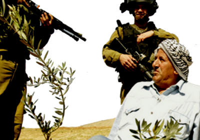 Bild links - israelische Soldaten bedrohen einen Palästinenser, der Bäume pflanzen will