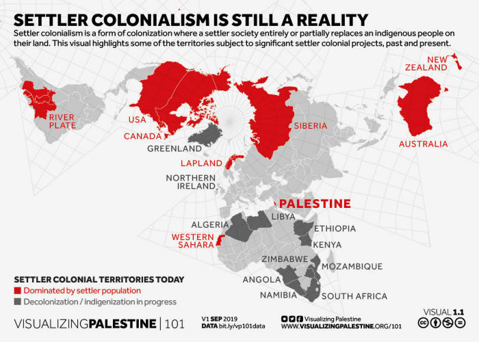 Dieses Bild zeigt einige der Gebiete, die im Laufe der Geschichte Kolonialprojekten unterworfen waren, insbesondere in Amerika, im südlichen Afrika und im Pazifikraum. Das Bild hebt Palästina als eines der Gebiete hervor, in denen die Kolonisation heute noch andauert.