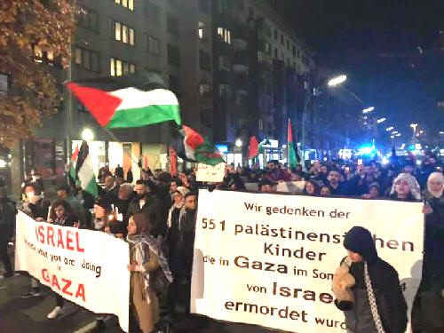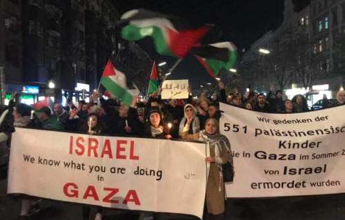 Wie die Organisatoren feststellten: "Wir stehen zum palästinensischen Volk, wir stehen zu Freiheit und Gerechtigkeit und wir schweigen nicht und werden es niemals sein!"