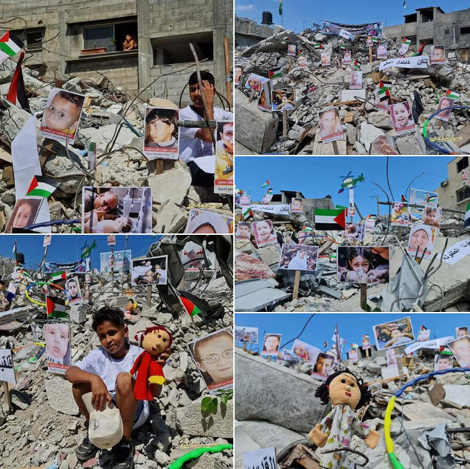 Eine palästinensische Jugendinitiative in #Gaza hat auf den Trümmern von Häusern, die von israelischen Luftangriffen bombardiert wurden, eine Galerie mit Bildern der 97 palästinensischen Kinder veranstaltet, die von "Israel" während seiner jüngsten Aggression gegen den belagerten Streifen getötet wurden.