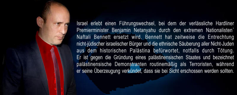 Israel erlebt einen Führungswechsel, bei dem der verlässliche Hardliner Premierminister Benjamin Netanyahu durch den extremen Nationalisten Naftali Bennett ersetzt wird. Bennett hat zeitweise die Entrechtung nicht-jüdischer israelischer Bürger und die ethnische Säuberung aller Nicht-Juden aus dem historischen Palästina befürwortet, notfalls durch Tötung. Er ist gegen die Gründung eines palästinensischen Staates und bezeichnet palästinensische Demonstranten routinemäßig als Terroristen, während er seine Überzeugung verkündet, dass sie bei Sicht erschossen werden sollten. Er hat sich auch damit gebrüstet, während seines Militärdienstes Palästinenser erschossen zu haben, und sagte an einer Stelle: "Ich habe schon viele Araber in meinem Leben getötet, und es gibt absolut kein Problem damit." Er war in den 1980er Jahren maßgeblich an der "Operation Trauben des Zorns" im Libanon beteiligt, wo seine Kommandoeinheit zahlreiche Zivilisten tötete, und erzählt gerne von seiner Beteiligung an Israels Kriegsverbrechen.