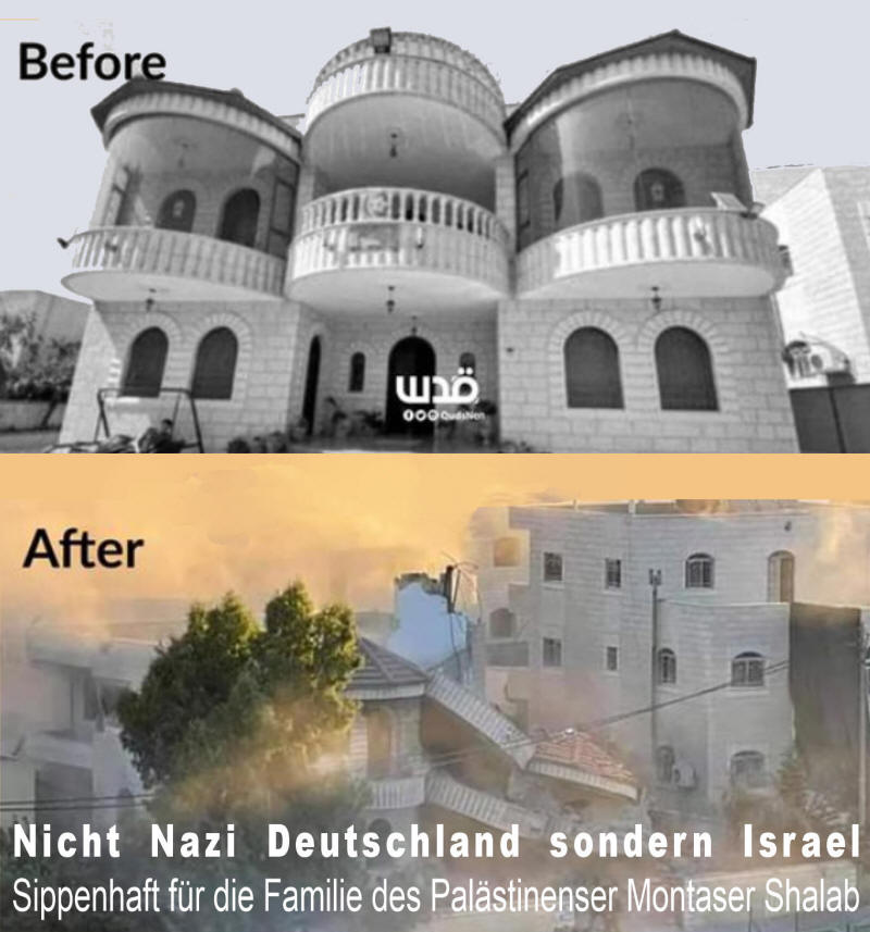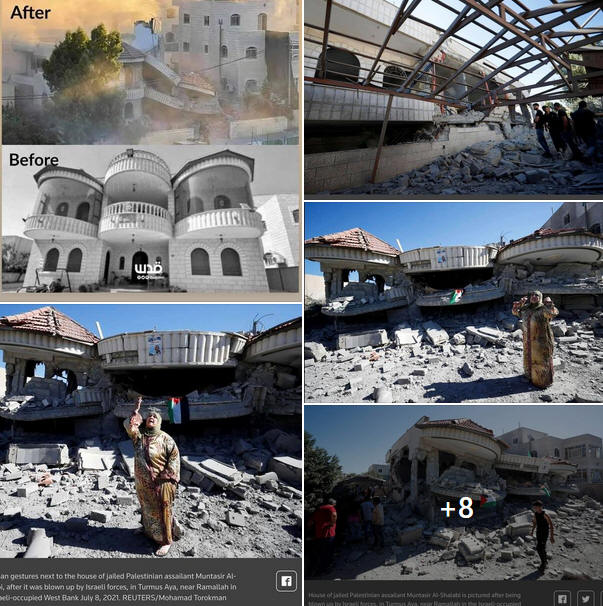 Das Foto zeigt das Haus des palästinensischen Gefangenen Montaser Shalabi im Dorf Turmus Ayya, bevor und nachdem es heute von 'Israel' als Strafmaßnahme gegen Shalabis Widerstandsaktivitäten bombardiert wurde. Quelle