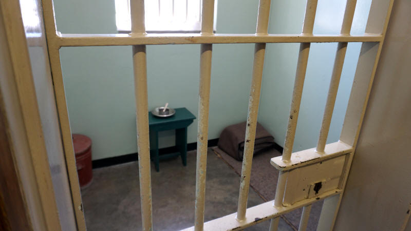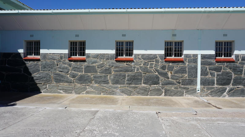 Der Guide zeigt auf das dritte Fenster von links in der Reihe. In dieser Zelle hat Südafrikas berühmtester Gefangener von 1964 bis 1982 gesessen: Nelson Mandela. Wir steigen in den Flur hinauf. Von einem langen schmalen Gang gehen die Zellen ab, die Türen stehen offen und gewähren den Blick ins Innere. Zweieinhalb Meter mal zweieinhalb Meter mussten für ein Jahrzehnte langes „Leben“ hier ausreichen. Ich blicke in Mandelas Zelle. Ein Hocker, ein Eimer für die Notdurft und eine Bastmatte mit zwei Decken darauf für die Nacht auf dem kalten Steinboden.