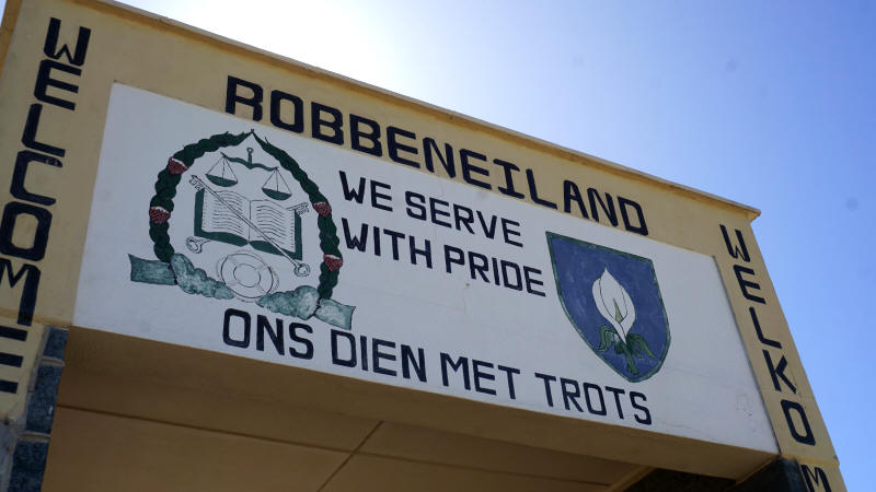 Das alte Eingangstor zur Gefängnisinsel steht noch und erinnert an ähnliche Tore, die in die Todeslager der Nazis führten. Wenn über dem Portal von Auschwitz der zynisch-barbarische Spruch „Arbeit macht frei“ steht, dann haben die weißen Herrscher des Apartheidstaates, die große Bewunderer Hitlers waren, für den Zugang von Robben Island die nicht weniger zynische Parole „Willkommen. Wir dienen mit Stolz“ ausgewählt. Natürlich wollte niemand in der Hölle von Robben Island „dienen“ und das offene Zeigen von“ Stolz“ wäre sicher als Widerstand gedeutet worden und wäre tödlich gewesen.