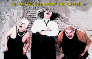 29.12.2007 - "Stuss", "bekloppt", "blöd", wie sich ein Mario Barth der Kulturjournalisten, ohne Quellenangabe, beim lesen des nachfolgenden Textes outet. >>> Die schwarze blaue Liste