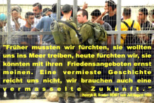 "Entweder wir oder sie, es geht ums Überleben. Mit einer solchen Blankovollmacht auf den eigenen Namen lässt sich alles begründen und rechtfertigen. Aber am Ende wendet sich diese Moral immer gegen ihren Urheber. Hat man sich erst einmal an eine chronische Notwehrsituation gewöhnt, kann man mit der Selbstverteidigung gar nicht mehr aufhören, es müssen ständig neue Feinde her. Nach den Arabern kommen die jüdischen Verräter an die Reihe, die Nestbeschmutzer und Symphatisanten. Moral und Menschlichkeit bleiben auf der Strecke, Logik und Vernunft kommen unter die Räder. " Quelle: SEMIT vom Juli/August 1989