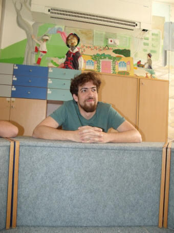 An diesem Morgen hat Guy erst zur dritten Stunde Unterricht. Sobald er auftaucht, kommen einige Kinder auf ihn zugelaufen und begrüßen ihn fröhlich. Er nimmt sich Zeit für sie und beantwortet ihre Fragen, mal auf Arabisch, mal auf Hebräisch. Dann gehen wir zum Theaterraum.
