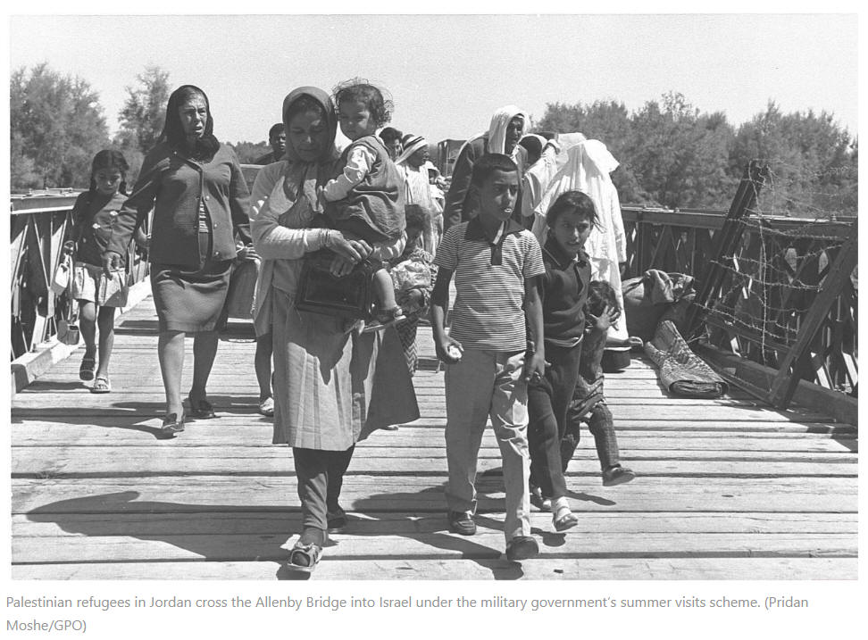 Palästinensische Flüchtlinge tragen ihre Habseligkeiten, als sie sich nach der israelischen Invasion des Westjordanlandes am 22. Juni 1967 darauf vorbereiten, die Allenby-Brücke über den Jordan zu überqueren.