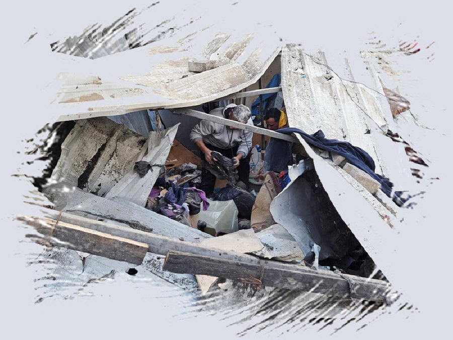 Männer durchsuchen persönliche Gegenstände in einer zerstörten Notunterkunft