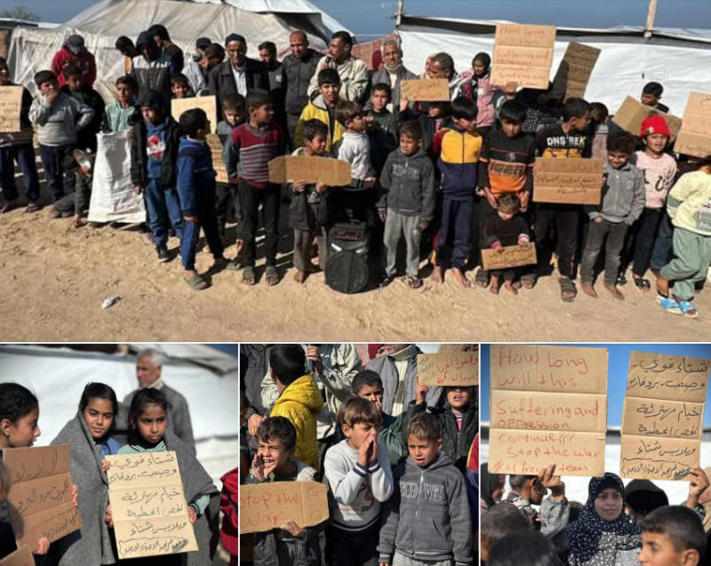 Vertriebene Familien im Al-Mawasi-Gebiet von Khan Yunis im Gazastreifen protestieren und fordern die internationale Gemeinschaft dringend auf, Zelte und Kleidung bereitzustellen,