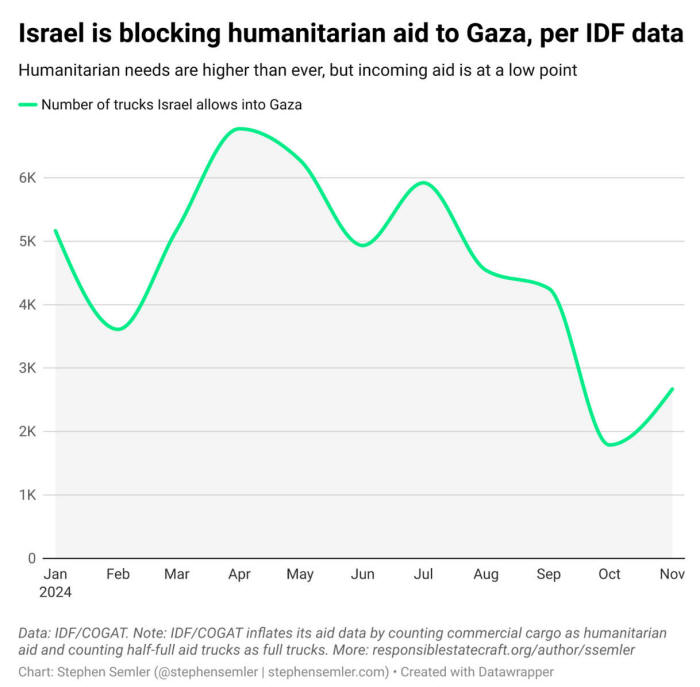 Wie der Journalist Stephen Semler bemerkte, gibt es zahlreiche Beweise, einschließlich der von Israel selbst veröffentlichten Zahlen, die die israelische Politik der Blockade von Hilfslieferungen nach Gaza bestätigen.