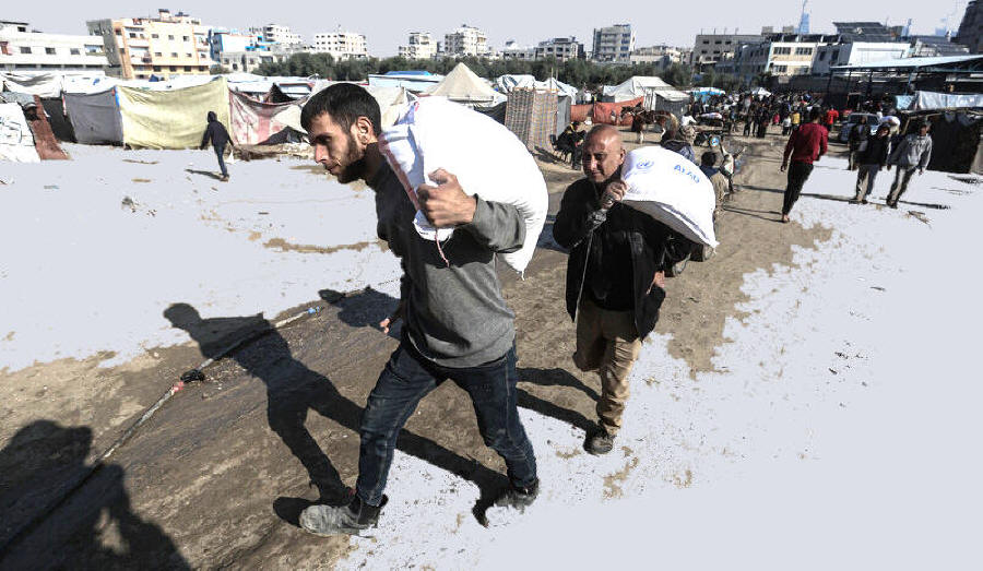 Die Suche nach Mehl in Gaza ist anstrengend. Hier tragen zwei Männer am 3. Dezember 2024 Mehlsäcke von einer Verteilungsstelle im Flüchtlingslager Nusseirat im mittleren Gazastreifen. Omar AshtawyAPA images