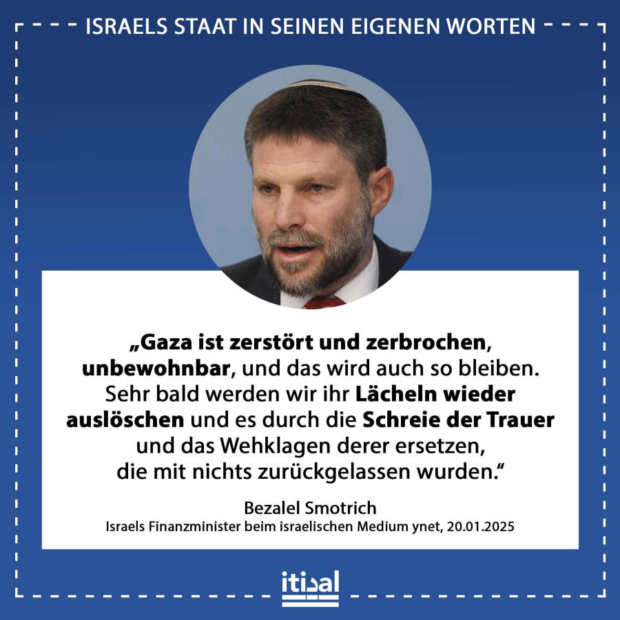 Er fordert, dass der Genozid nach Phase 1 des vereinbarten Deals weitergeht. Das israelische Kabinett nahm den Deal aber an. Nach Gesprächen mit Premierminister Netanyahu wurde dem Kabinettsbeschluss eine Klausel hinzugefügt, die besagt, dass Israel die Angriffe auf Gaza „mit voller Wucht“ wieder aufnimmt, den gesamten Gazastreifen besetzen und die vollständige Kontrolle über die humanitäre Hilfe übernehmen wird – was Smotrich als „Sauerstoffleitung der Hamas“ bezeichnet.